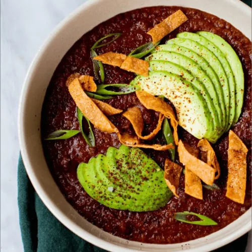 - Ladle the soup into bowls and serve with crunchy tortilla strips. avocado, lime juice, and a sprinkle of chili powder. Enjoy!